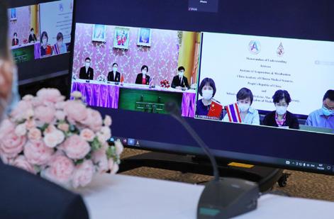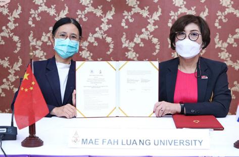 Gajaseni, Vice President of Mae Fah Luang University presided over the signing ceremony of Memorandum of Understanding (MoU) between the School of Integrative Medicine, Mae Fah Luang University and Institute of Acupuncture & Moxibustion, China Academy of Chinese Medical Sciences, the People’s Republic of China. The MoU was signed by Dr. Sulukkana Noiprasert, M.D., Dean of the School of Integrative Medicine and Prof. Jing Xianghong, Director of the Institute of Acupuncture & Moxibustion, China Academy of Chinese Medical Sciences via online platform.