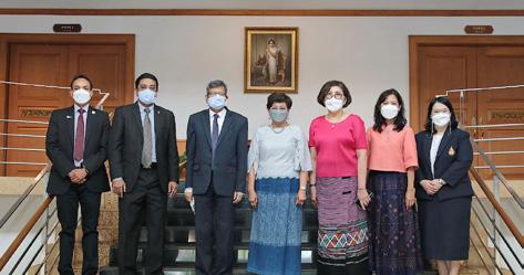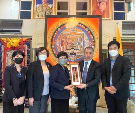 On 7 July 2022, Assoc.Prof.Dr. Chayaporn Wattanasiri, President of Mae Fah Luang University; Assoc.Prof.Dr. Nantana Gajaseni, Vice President; Asst.Prof.Dr. Chompunut Sopajaree, Acting Dean of the School of Nursing; and Mr. Wangchuk Rabtan, Bhutanese lecturer of the School of Management paid a courtesy visit to H.E. Mr. Kinzang Dorji, Ambassador of Bhutan to Thailand and Mr. Kinley Dorji, Second Secretary at the Royal Bhutanese Embassy in Bangkok. The purposes of this visit were strengthening relations and discussing possibilities to initiate projects to enhance cooperation with Bhutan.