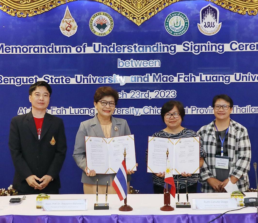 On 23 March 2023, Assoc. Prof. Dr.Chayaporn Wattanasiri, President of Mae Fah Luang University; and Dr. Ruth C. Diego, Director of Agri-based Technology Business Incubator/Innovation Center (AATBI), Benguet State University, the Philippines signed the Memorandum of Understanding (MoU) between Mae Fah Luang University and Benguet State University at Chiang Saen Meeting Room, Vanchai Sirichana Building, Mae Fah Luang University. Benguet State University (BSU) is the coordinator of Agri-Aqua Technology Business Incubator (AATBI) network which consists of 22 universities in the Philippines. This agreement was a part of collaboration between AATBI and Northern Science Park (consisting of MFU Science Park, Innovation and Technology Transfer Institute of University of Phayao, and Maejo Agro Food Park).