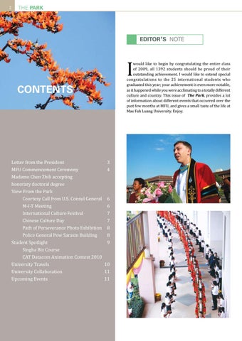 Letter from the President 3 MFU Commencement Ceremony 4 Madame Chen Zhili accepting honorary doctoral degree View From the Park Courtesy Call from U.S. Consul General 6 M-I-T Meeting 6 International Culture Festival 7 Chinese Culture Day 7 Path of Perseverance Photo Exhibition 8 Police General Pow Sarasin Building 8 Student Spotlight 9 Singha Biz Course CAT Datacom Animation Contest 2010 University Travels 10 University Collaboration 11 Upcoming Events 11