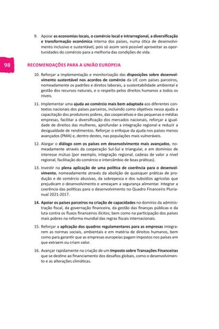 RECOMENDAÇÕES PARA A UNIÃO EUROPEIA 10. Reforçar a implementação e monitorização das disposições sobre desenvolvimento sustentável nos acordos de comércio da UE com países parceiros, nomeadamente os padrões e diretos laborais, a sustentabilidade ambiental e gestão dos recursos naturais, e o respeito pelos direitos humanos a todos os níveis. 11. Implementar uma ajuda ao comércio mais bem adaptada aos diferentes contextos nacionais dos países parceiros, incluindo como objetivos nessa ajuda a capacitação dos produtores pobres, das cooperativas e das pequenas e médias empresas, facilitar a diversificação dos mercados nacionais, reforçar a igualdade de direitos das mulheres, aprofundar a integração regional e reduzir a desigualdade de rendimentos. Reforçar o enfoque da ajuda nos países menos avançados (PMA) e, dentro destes, nas populações mais vulneráveis. 12. Alargar o diálogo com os países em desenvolvimento mais avançados, nomeadamente através da cooperação Sul-Sul e triangular, e em domínios de interesse mútuo (por exemplo, integração regional, cadeias de valor a nível regional, facilitação do comércio e intercâmbio de boas práticas). 13. Investir na plena aplicação de uma política de coerência para o desenvolvimento, nomeadamente através da abolição de quaisquer práticas de produção e de comércio abusivas, da sobrepesca e dos subsídios agrícolas que prejudicam o desenvolvimento e ameaçam a segurança alimentar. Integrar a coerência das políticas para o desenvolvimento no Quadro Financeiro Plurianual 2021-2017. 14. Apoiar os países parceiros na criação de capacidades no domínio da administração fiscal, da governação financeira, da gestão das finanças públicas e da luta contra os fluxos financeiros ilícitos; bem como na participação dos países mais pobres na reforma mundial das regras fiscais internacionais. 15. Reforçar a aplicação dos quadros regulamentares para as empresas integrarem as normas sociais, ambientais e em matéria de direitos humanos, bem como para garantir que as empresas europeias pagam impostos nos países em que extraem ou criam valor. 16. Avançar rapidamente na criação de um Imposto sobre Transações Financeiras que se destine ao financiamento dos desafios globais, como o desenvolvimento e as alterações climáticas.