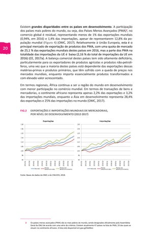Existem grandes disparidades entre os países em desenvolvimento. A participação dos países mais pobres do mundo, ou seja, dos Países Menos Avançados (PMA)2, no comercio global é residual, representando menos de 1% das exportações mundiais (0,94%, em 2016) e 1,4% das importações, apesar de representarem 12,8% da população mundial (Figura 4) (OMC, 2017). Relativamente à União Europeia, esta é o principal mercado de exportação de produtos dos PMA, com uma quota de mercado de 25,1 % das exportações mundiais destes países em 2016, mas a parte dos PMA na totalidade das importações da UE é baixa (2,16 % do total de importações da UE em 2016) (CE, 2017a). A balança comercial destes países tem sido altamente deficitária, particularmente para os exportadores de produtos agrícolas e produtos não-petrolíferos, uma vez que a maioria destes países está dependente das exportações dessas matérias-primas e produtos primários, que têm sofrido com a queda de preços nos mercados mundiais, enquanto importa essencialmente produtos transformados e com elevado valor acrescentado. Em termos regionais, África continua a ser a região do mundo em desenvolvimento com menor participação no comércio mundial. Em termos de transações de bens e mercadorias, o continente africano representa apenas 2,2% das exportações e 3,2% das importações mundiais, enquanto a Ásia em desenvolvimento representa 28,4% das exportações e 25% das importações no mundo (OMC, 2017). FIG.2