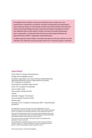 Um agradecimento é devido a todos que contribuíram para o estudo com o seu conhecimento e experiência na temática, incluindo no fornecimento de informação e como autores de artigos ou entrevistados: Sandra Lima Coelho (Católica Porto Business School e Associação Diálogo Acontece), Samuel Poos (Trade for Development Centre), Jean Saldanha (Senior Policy Advisor, CIDSE), Ana Paula Fernandes (Organização para a Cooperação e o Desenvolvimento Económico), Pedro Krupenski (Diretor de Desenvolvimento, OIKOS – Cooperação e Desenvolvimento). As ideias expressas nestes artigos e entrevistas são apenas as dos seus autores, em nome individual, não refletindo nenhuma posição oficial nem vinculando qualquer instituição.