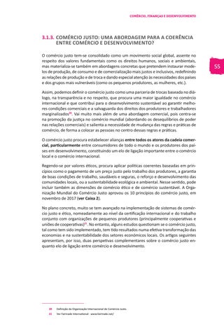 3.1.3. COMÉRCIO JUSTO: UMA ABORDAGEM PARA A COERÊNCIA ENTRE COMÉRCIO E DESENVOLVIMENTO? O comércio justo tem-se consolidado como um movimento social global, assente no respeito dos valores fundamentais como os direitos humanos, sociais e ambientais, mas materializa-se também em abordagens concretas que pretendem instaurar modelos de produção, de consumo e de comercialização mais justos e inclusivos, redefinindo as relações de produção e de troca e dando especial atenção às necessidades dos países e dos grupos mais vulneráveis (como os pequenos produtores, as mulheres, etc.). Assim, podemos definir o comércio justo como uma parceria de trocas baseada no diálogo, na transparência e no respeito, que procura uma maior igualdade no comércio internacional e que contribui para o desenvolvimento sustentável ao garantir melhores condições comerciais e a salvaguarda dos direitos dos produtores e trabalhadores marginalizados20. Vai muito mais além de uma abordagem comercial, pois centra-se na promoção da justiça no comércio mundial (abordando os desequilíbrios de poder nas relações comerciais) e salienta a necessidade de mudança das regras e práticas de comércio, de forma a colocar as pessoas no centro dessas regras e práticas. O comércio justo procura estabelecer alianças entre todos os atores da cadeia comercial, particularmente entre consumidores de todo o mundo e os produtores dos países em desenvolvimento, constituindo um elo de ligação importante entre o comércio local e o comércio internacional. Regendo-se por valores éticos, procura aplicar políticas coerentes baseadas em princípios como o pagamento de um preço justo pelo trabalho dos produtores, a garantia de boas condições de trabalho, saudáveis e seguras, o reforço e desenvolvimento das comunidades locais, ou a sustentabilidade ecológica e ambiental. Nesse sentido, pode incluir também as dimensões de comércio ético e de comércio sustentável. A Organização Mundial do Comércio Justo aprovou os 10 princípios do comércio justo, em novembro de 2017 (ver Caixa 2). No plano concreto, muito se tem avançado na implementação de sistemas de comércio justo e ético, nomeadamente ao nível da certificação internacional e do trabalho conjunto com organizações de pequenos produtores (principalmente cooperativas e uniões de cooperativas)21. No entanto, alguns estudos questionam se o comércio justo, tal como tem sido implementado, tem tido resultados numa efetiva transformação das economias e na sustentabilidade dos setores económicos locais. Os artigos seguintes apresentam, por isso, duas perspetivas complementares sobre o comércio justo enquanto elo de ligação entre comércio e desenvolvimento.