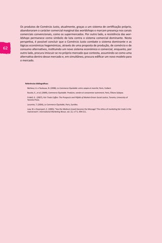 Referências bibliográficas: Bécheur, A. e Toulouse, N. (2008), Le Commerce Équitable: entre utopie et marché, Paris, Vuibert. Bucolo, E., et al, (2009), Commerce Équitable. Produire, vendre et consommer autrement, Paris, Éitions Sylepse. Fridell, G. (2007), Fair Trade Coffee: The Prospects and Pitfalls of Market-Driven Social Justice, Toronto, University of Toronto Press. Lecomte, T. (2004), Le Commerce Équitable, Paris, Eyrolles. Low, W. e Davenport, E. (2005), “Has the Medium (roast) become the Message? The ethics of marketing fair trade in the mainstream”, International Marketing Revue, vol. 22, n.º 5, 494-511.