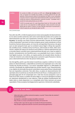 Para além dos APE, a União Europeia procura incluir preocupações de desenvolvimento nos vários acordos comerciais, bem como noutro tipo de acordos com os países em desenvolvimento que têm uma componente comercial, como é o caso dos acordos de pesca. Os Acordos com Países Terceiros (denominados “Acordos de Parceria para a Pesca Sustentável”) permitem às frotas europeias pescar stocks excedentes na Zona Económica Exclusiva desses países, em troca de contrapartidas financeiras e do apoio quer ao setor pesqueiro local, quer ao combate à pesca ilegal e reforço das capacidades científicas locais. A Política Comum de Pescas, reformulada em 2014, refere claramente o objetivo de reforço da coerência entre políticas e salienta explicitamente que os Acordos devem contribuir para o desenvolvimento do país com o qual se celebra o Acordo, nomeadamente com benefício para a sua população local e para a indústria local ligada às pescas. Com efeito, um aspeto positivo da evolução destes Acordos é o facto de incluírem uma visão de longo prazo e preverem apoio financeiro e técnico para o desenvolvimento do setor das pescas nestes países. Isto não significa, porém, que não existam incoerências e aspetos a melhorar. Em muitos países em desenvolvimento, a dependência económica da cooperação com a UE (e das receitas dos Acordos de Pesca), a sua menor capacidade negocial e as dificuldades de controlo e fiscalização da implementação dos acordos levaram a que, frequentemente, o seu objetivo de promoção das pescas sustentáveis nesses países ficasse subvalorizado face aos imperativos comerciais. Para além disso, os países em desenvolvimento têm apontado várias incoerências aos Acordos de Parceria de Pescas: a inadequação da compensação paga pela UE em comparação com o valor dos recursos pesqueiros a que as frotas da UE têm acesso; as práticas de pesca ilegal e a recusa de operadores europeus em reportarem devidamente as suas capturas; a falta de análises cientificamente validadas sobre os stocks disponíveis; ou a competição entre frotas nacionais com pouca capacidade e frotas europeias tecnologicamente superiores e fortemente subsidiadas.