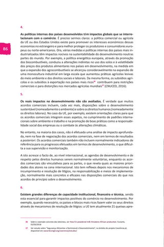As políticas internas dos países desenvolvidos têm impactos globais que se interrelacionam com o comércio. É preciso sermos claros: a política comercial ou agrícola da UE ou dos Estados Unidos existe para promover os interesses económicos dessas economias no estrangeiro e para melhor proteger os produtores e consumidores europeus ou norte-americanos. Ora, várias medidas e políticas internas dos países mais industrializados têm impactos nocivos na sustentabilidade do desenvolvimento noutras partes do mundo. Por exemplo, a política energética europeia, através da promoção dos biocombustíveis, conduziu a alterações indiretas no uso dos solos e à volatilidade dos preços dos produtos alimentares nos países em desenvolvimento, na medida em que a expansão dos agrocombustíveis se alicerçou consideravelmente na expansão de uma monocultura industrial em larga escala que aumentou práticas agrícolas lesivas do meio ambiente e dos direitos sociais e laborais. Da mesma forma, os subsídios agrícolas e os subsídios à exportação nos países mais ricos36 contribuem para restrições comerciais e para distorções nos mercados agrícolas mundiais37 (CNUCED, 2016). 5. Os reais impactos no desenvolvimento não são avaliados. É verdade que muitos acordos comerciais incluem, cada vez mais, disposições sobre o desenvolvimento sustentável (nomeadamente o ambiente) e sobre os direitos humanos (nomeadamente os direitos laboras). No caso da UE, por exemplo, existem orientações claras para que os acordos comerciais integrem esses aspetos, no cumprimento de padrões internacionais sobre ambiente e trabalho e na promoção de boas práticas como a responsabilidade social das empresas ou o combate às alterações climáticas. No entanto, na maioria dos casos, não é efetuada uma análise de impacto aprofundada, nem na fase de negociação dos acordos comerciais, nem em termos de resultados a posteriori. Os acordos comerciais também não incluem normalmente indicadores de referência para os progressos efetuados em termos de desenvolvimento, o que dificulta a sua supervisão e monitorização. A isto acresce o facto de, ao nível internacional, as agendas de desenvolvimento e de respeito pelos direitos humanos serem normalmente voluntárias, enquanto os acordos comerciais são vinculativos para as partes, o que revela quais as maiores prioridades dos atores na cena internacional. Isto tem reflexos depois nos mecanismos de incumprimento e resolução de litígios, na responsabilização e meios de implementação, normalmente mais concretos e eficazes nas disposições comerciais do que nos acordos de princípio sobre o desenvolvimento. 6. Existem grandes diferenças de capacidade institucional, financeira e técnica, sendo esta essencial para garantir impactos positivos do comércio no desenvolvimento. Por exemplo, quando necessário, os países e blocos mais ricos fazem valer os seus direitos através de mecanismos de resolução de litígios: a UE tem atualmente 21 queixas apre-