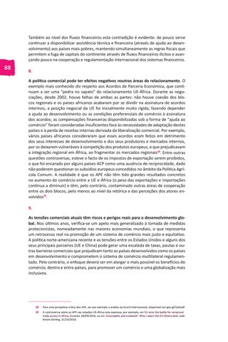 8. A política comercial pode ter efeitos negativos noutras áreas de relacionamento. O exemplo mais conhecido diz respeito aos Acordos de Parceria Económica, que continuam a ser uma “pedra no sapato” do relacionamento UE-África. Durante as negociações, desde 2002, houve falhas de ambas as partes: não houve coesão dos blocos regionais e os países africanos acabaram por se dividir na assinatura de acordos interinos; a posição negocial da UE foi inicialmente muito rígida, fazendo depender a ajuda ao desenvolvimento ou as condições preferenciais de comércio à assinatura dos acordos; as compensações financeiras disponibilizadas sob a forma de “ajuda ao comércio” foram consideradas insuficientes face às necessidades de adaptação destes países e à perda de receitas internas derivada da liberalização comercial. Por exemplo, vários países africanos consideraram que esses acordos eram feitos em detrimento dos seus interesses de desenvolvimento e dos seus produtores e mercados internos, por os deixarem vulneráveis à competição dos produtos europeus, e que prejudicavam a integração regional em África, ao fragmentar os mercados regionais38. Entre outras questões controversas, esteve o facto de os impostos de exportação serem proibidos, o que foi encarado por alguns países ACP como uma ausência de reciprocidade, dado não poderem questionar os subsídios europeus concedidos no âmbito da Política Agrícola Comum. A realidade é que os APE não têm tido grandes resultados concretos no aumento do comércio entre a UE e África (o peso das exportações e importações continua a diminuir) e têm, pelo contrário, contaminado outras áreas de cooperação entre os dois blocos, pelo menos ao nível da retórica e das perceções dos atores envolvidos39. 9. As tensões comerciais atuais têm riscos e perigos reais para o desenvolvimento global. Nos últimos anos, verifica-se um apelo mais generalizado à tomada de medidas protecionistas, nomeadamente nas maiores economias mundiais, o que representa um retrocesso real na promoção de um sistema de comércio mais justo e equitativo. A política norte-americana recente e as tensões entre os Estados Unidos e alguns dos seus principais parceiros (UE e China) pode gerar uma escalada de taxas, pautas e outras barreiras comerciais que prejudicam tanto os países desenvolvidos como os países em desenvolvimento e comprometem o sistema de comércio multilateral regulamentado. Pelo contrário, o enfoque deverá ser em alargar o mais possível os benefícios do comércio, dentro e entre países, para promover um comércio e uma globalização mais inclusivos.