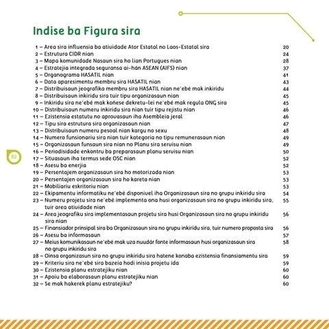 1 – Area sira influensia ba atividade Ator Estatal no Laos-Estatal sira 2 – Estrutura CIDR nian 3 – Mapa komunidade Nasaun sira ho lian Portugues nian 4 – Estratejia integrada seguransa ai-hán ASEAN (AIFS) nian 5 – Organograma HASATIL nian 6 – Data aparesimentu membru sira HASATIL nian 7 – Distribuisaun jeografika membru sira HASATIL nian ne’ebé mak inkiridu 8 – Distribuisaun inkiridu sira tuir tipu organizasaun nian 9 – Inkiridu sira ne’ebé mak koñese dekretu-lei ne’ebé mak regula ONG sira 10 – Distribuisaun numeru inkiridu sira nian tuir tipu rejistu nian 11 – Ezistensia estatutu no aprovasaun iha Asembleia jeral 12 – Tipu sira estrutura sira organizasaun nian 13 – Distribuisaun numeru pesoal nian kargu no sexu 14 – Numero funsionariu sira nian tuir kategoria no tipu remunerasaun nian 15 – Organizasaun funsaun sira nian no Planu sira servisu nian 16 – Periodisidade enkontru ba preparasaun planu servisu nian 17 – Situasaun iha termus sede OSC nian 18 – Asesu ba enerjia 19 – Persentajem organizasaun sira ho motorizada nian 20 – Persentajen organizasaun sira ho kareta nian 21 – Mobiliariu eskritoriu nian 22 – Ekipamentu informatiku ne’ebé disponivel iha Organizasaun sira no grupu inkiridu sira 23 – Numeru projetu sira ne’ebé implementa ona husi organizasaun sira no grupu inkiridu sira, tuir area atividade nian 24 – Area jeografiku sira implementasaun projetu sira husi Organizasaun sira no grupu inkiridu sira nian 25 – Finansiador prinsipal sira ba Organizasaun sira no grupu inkiridu sira, tuir numero proposta sira 26 – Asesu ba informasaun 27 – Meius komunikasaun ne’ebé mak uza nuudár fonte informasaun husi organizasaun sira no grupu inkiridu sira 28 – Oinsa organizasun sira no grupu inkiridu sira hatene konaba ezistensia finansiamentu sira 29 – Kriteriu sira ne’ebé sira bazeia hodi inisia projetu ida 30 – Ezistensia planu estratejiku nian 31 – Apoiu ba elaborasaun planu estratejiku nian 32 – Se mak hakerek planu estratejiku?