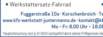 TRADITIONSVERBUNDEN LEIDENSCHAFTLICH Gereonstr. 43 · 41238 MG – Schelsen (wenige Minuten von Korschenbroich entfernt) Tel. 02166 6478470 www.hoppe-kuechenstudio.de Musterküchen zum Sonderpreis abzugeben! Tischlerei Marie-Curie-Str. 14 · 41515 Grevenbroich Tel. 02181 / 4954651 TRADITIONSVERBUNDEN LEIDENSCHAFTLICH Am Anfang ist der Baum. Parkett · Möbelbau · Türen www.gestaltung-in-holz.com Parkett- & Türenstudio Hindenburgstr. 53 · 41352 Korschenbroich Tel. 02161 / 6786311