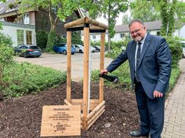 Bürgermeister Marc Venten und Sandra Fischer vom Stadtmarketing hinter der Guckloch-Stellwand zum Stadtjubiläum