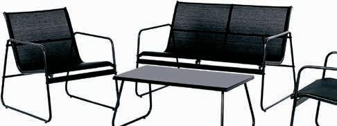 Savaneta Textilene schwarz, Gestell Metall schwarz, Bank: 113 x 74 x 77 cm, Sessel: 59 x 74 x 77 cm, Beistelltisch mit Glasplatte: 85 x 38 x 45 cm