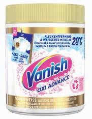Un detergente che pulisce con efficacia, preferibilmente ecologico e a risparmio energetico: Vanish Oxi Advance risponde a questi requisiti. La collaudata formula Oxi agisce già a 20 °C e in soli 30 minuti, assicurando una pulizia igienica e una rimozione profonda delle macchie anche in condizioni difficili. A ciò si aggiungono più efficacia nell’eliminare gli odori e la protezione dei colori senza cloro, che assicura tinte brillanti e un bianco splendente.