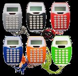 Descripción: Calculadora de plástico a pilas, con sujetador de pita de color.