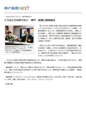 同法⼈は2⽉から神⼾市内を拠点に、無料電話相談(通話 代は有料)を開始。6⽉からは⾼槻市にも拠点を設けた。8 ⽉末までに、2カ所に計13⼈から33件の相談が寄せられ た。経済的不安や性的虐待に関する相談や、「誰の⼦か分か らない」などの内容だったという。