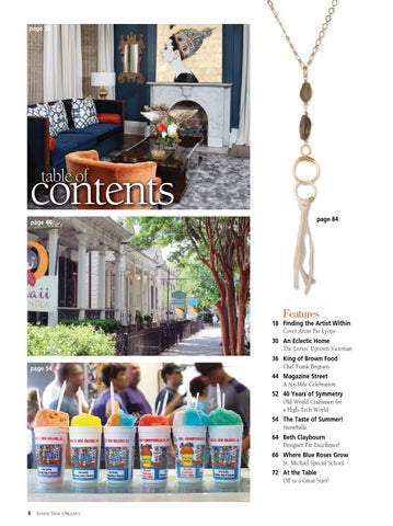36 King of Brown Food Chef Frank Brigtsen 44 Magazine Street A Six-Mile Celebration 52 40 Years of Symmetry Old World Craftsmen for a High-Tech World 54 The Taste of Summer! Snowballs 64 Beth Claybourn Designer Par Excellence! 66 Where Blue Roses Grow St. Michael Special School 72 At the Table Off to a Great Start!