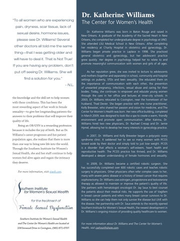 Dr. Katherine Williams The Center for Women’s Health Dr. Katherine Williams was born in Baton Rouge and raised in New Orleans. A graduate of the Academy of the Sacred Heart in New Orleans, she completed her undergraduate degree in psychology at UNO. She attended LSU Medical School in New Orleans. After completing her residency at Charity Hospital in obstetrics and gynecology, Dr. Williams began private practice in Laplace in 1998. She practiced general obstetrics and gynecology, but her adolescent practice grew quickly. Her degree in psychology helped her to relate to and promote meaningful communication with women and girls of all ages. As her reputation grew, she was invited to lecture to adolescents and mothers (together and separately) in school, community and hospital settings on puberty, STDs and teen sexuality. She educated them on the importance of communication with each other, the prevention of unwanted pregnancy, infections, sexual abuse and caring for their bodies. Today, she continues to empower and educate young women through the care in her office and lectures at inner-city schools. In 2003, Dr. Williams relocated to Covington, near the hometown of her husband, Thad Devier. She began practice with one nurse practitioner, Kelly Brewster, who shared her passion and vision for medicine, and The Center for Women’s Health was born. Her new office building, completed in March 2009, was designed to look like a spa to create a warm, friendly environment and promote open communication. After Katrina, Dr. Williams hired two new physicians, Dr. Rachael Cresap and Dr. Jamie Hymel, allowing her to develop her many interests in gynecology practice. In 2007, Dr. Williams and Kelly Brewster began a polycystic ovary syndrome clinic. It saddened her to see so many women with PCOS tossed aside by their doctor and simply told to just lose weight. PCOS is a disorder that affects a woman’s self-esteem, heart health and reproductive health. The PCOS practice has thrived, and Dr. Williams developed a deeper understanding of female hormones and sexuality. In 2009, Dr. Williams became a certified robotic surgeon. She has successfully completed over 600 robotic cases and teaches robotic surgery to physicians. Other physicians often refer complex cases to her, many with severe pelvic disease or a history of breast cancer that requires oophorectomy. Dr. Williams uses estrogen, progesterone and testosterone therapy as allowed to maintain or improve the patient’s quality of life. She partners with hematologist oncologist Dr. Jay Saux to best counsel the patients about their medical risks. He supports the use of Vagifem in breast cancer patients and refers many breast cancer survivors to Dr. Williams so she can help them not only survive the disease but LIVE with the disease. Her partnership with Dr. Saux extends to the recently opened Southern Institute for Women’s Sexual Health, the newest development in Dr. Williams’s ongoing mission of providing quality healthcare to women.