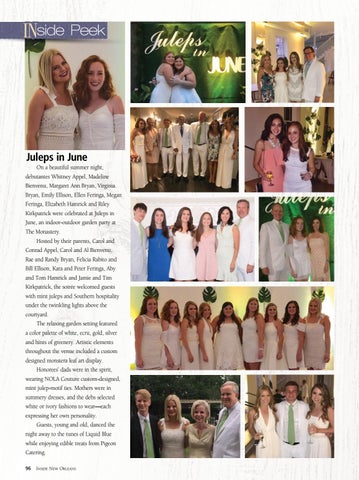 Juleps in June On a beautiful summer night, debutantes Whitney Appel, Madeline Bienvenu, Margaret Ann Bryan, Virginia Bryan, Emily Ellison, Ellen Feringa, Megan Feringa, Elizabeth Hamrick and Riley Kirkpatrick were celebrated at Juleps in June, an indoor-outdoor garden party at The Monastery. Hosted by their parents, Carol and Conrad Appel, Carol and Al Bienvenu, Rae and Randy Bryan, Felicia Rabito and Bill Ellison, Kara and Peter Feringa, Aby and Tom Hamrick and Jamie and Tim Kirkpatrick, the soirée welcomed guests with mint juleps and Southern hospitality under the twinkling lights above the courtyard. The relaxing garden setting featured a color palette of white, ecru, gold, silver and hints of greenery. Artistic elements throughout the venue included a custom designed monstera leaf art display. Honorees’ dads were in the spirit, wearing NOLA Couture custom-designed, mint julep-motif ties. Mothers were in summery dresses, and the debs selected white or ivory fashions to wear—each expressing her own personality. Guests, young and old, danced the night away to the tunes of Liquid Blue while enjoying edible treats from Pigeon Catering. 96