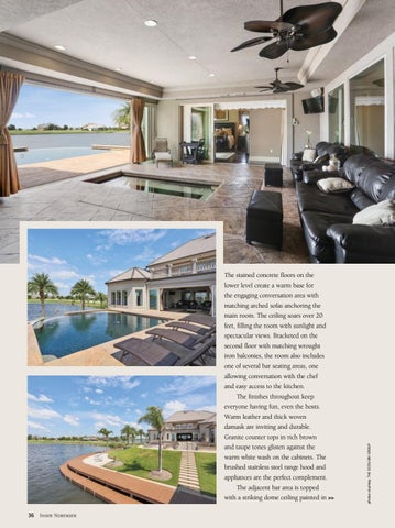 The stained concrete floors on the lower level create a warm base for the engaging conversation area with matching arched sofas anchoring the main room. The ceiling soars over 20 feet, filling the room with sunlight and spectacular views. Bracketed on the second floor with matching wrought iron balconies, the room also includes one of several bar seating areas, one allowing conversation with the chef and easy access to the kitchen. The finishes throughout keep everyone having fun, even the hosts. Warm leather and thick woven damask are inviting and durable. Granite counter tops in rich brown and taupe tones glisten against the warm white wash on the cabinets. The brushed stainless steel range hood and appliances are the perfect complement. The adjacent bar area is topped with a striking dome ceiling painted in >>