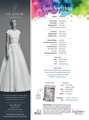 INSIDE NEW ORLEANS is published bi-monthly (February, April, June, August, October, December) by M and L Publishing, LLC, PO Box 6048, Metairie, LA 70009 as a means of communication and information for greater New Orleans, Louisiana. Bulk Postage paid - New Orleans, LA. Copyright ©2018 by M & L Publishing, LLC. No part of this magazine may be reproduced without written consent of publisher. Publisher is not responsible for unsolicited manuscripts and artwork. Inside New Orleans Magazine is created using the Adobe Creative Suite on Apple Macintosh computers.