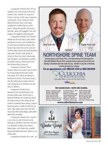 Comparison Number One. If Tony Angello’s were still around and served mussels, they wouldn’t be as good as Fausto’s, because of the saucy marinara’s contribution. Tony’s food was much admired because there were many straight New Orleans flavors on his menu. Things like gumbo and oysters Bienville, along with eggplant Tina, like lasagna, the eggplant replacing pasta. Comparison Number Two: Pascal’s Manale has the best fancy oyster dishes (and great raw ones, too) in addition to its more famous barbecue shrimp. But Fausto’s has them beat on the veal and chicken dishes and on the predominantly pasta piles. Fausto’s wide spread of variety in those two areas is fascinating. Best examples: veal saltimbocca and the irresistible arancini, which may be the best Sicilian dish of them all. Comparison Number Three: Andrea’s takes this another step forward by having seafood and major steaks and chops, all of which are filleted or butchered in house. The funny thing is that the Italian basics—pasta and red sauce being the most familiar—are just okay at Andrea’s. Comparison Number Four: Impastato’s has everybody beat in the serving of basic pasta. Its best shot is fettuccine Alfredo, the noodles for which are made in house with a thinness that results in a fantastic flavor release. Fausto’s fettuccine pasta is a little too thick for my tastes. They make up for that with their sauces and other pasta shapes, particularly dishes like cannelloni. Comparison Number Five. Fausto’s is in a close tie with Vincent’s in the making of cannelloni. But then Vincent’s is a decidedly Sicilian-New Orleans Italian place, with dishes like crawfish bisque and blackened tuna. Which is my whole point. Comparison Number Six is self- >> March-April 2018 53