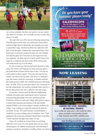 rise to these standards, but they were quick to cut any coaches who didn’t live by them. “We’ve actually cut more coaches than players,” he adds. The team’s first year, 2016, was one of learning and growing. With fifty players on the roster, ten coaches and a home field at Lakeshore High School in Mandeville, the Cardinals were ready to spread their wings. And their loyal fans were right there with them. In the first game, Cardinals fans outnumbered those of the home team. To everyone’s surprise but their own, the Cardinals won that first game 22-0. From then on, the league knew they were legitimate. The Birds only lost to the #1 and #2 teams in the league by a combined total of two points. Both of those teams were ranked in the top 15 in the nation. By their second year, Narcisse had found sponsors to help defray the $750-$1,350 expenses for home and away games. Jim Quakenbush of Gators Quick Stop on Hwy. 434 was one of the earliest to show support. “I buy into this team for two reasons. My wife is from Lacombe, and Gerrin is a dedicated man who wants to help the community, its families and kids. Idle hands get into trouble; the Cardinals keep many idle hands busy,” he adds. “Plus, the team gives back to the community”— just like Quakenbush, who redeems Cardinals ticket stubs for a free hot dog and an entry into a raffle for a free tank of gas. In year three, Narcisse spent the offseason solidifying the Cardinal’s non-profit status, marketing the team to businesses and promoting partnerships. One such community partner, Northshore Technical Community College, offers grants to players to further their education and transition to life after football. Brandon Dolliole is one of seven players currently enrolled in the college. “I was working as a waiter but wanted to do better for my family,” he says. “On Coach Narcisse’s recommendation, I enrolled in a two-year welding course at Northshore Tech.” With graduation only a year away, Brandon’s already had two job offers. “I wish I had done this eight years earlier,” he says. Today, the Cardinals are in their third year and flying high with a 4-0 record. As word spreads about the fun, familyoriented games, the halftime entertainment, mini-cheerleaders and great concessions, attendance is swelling. (There were about >> May-June 2019 89