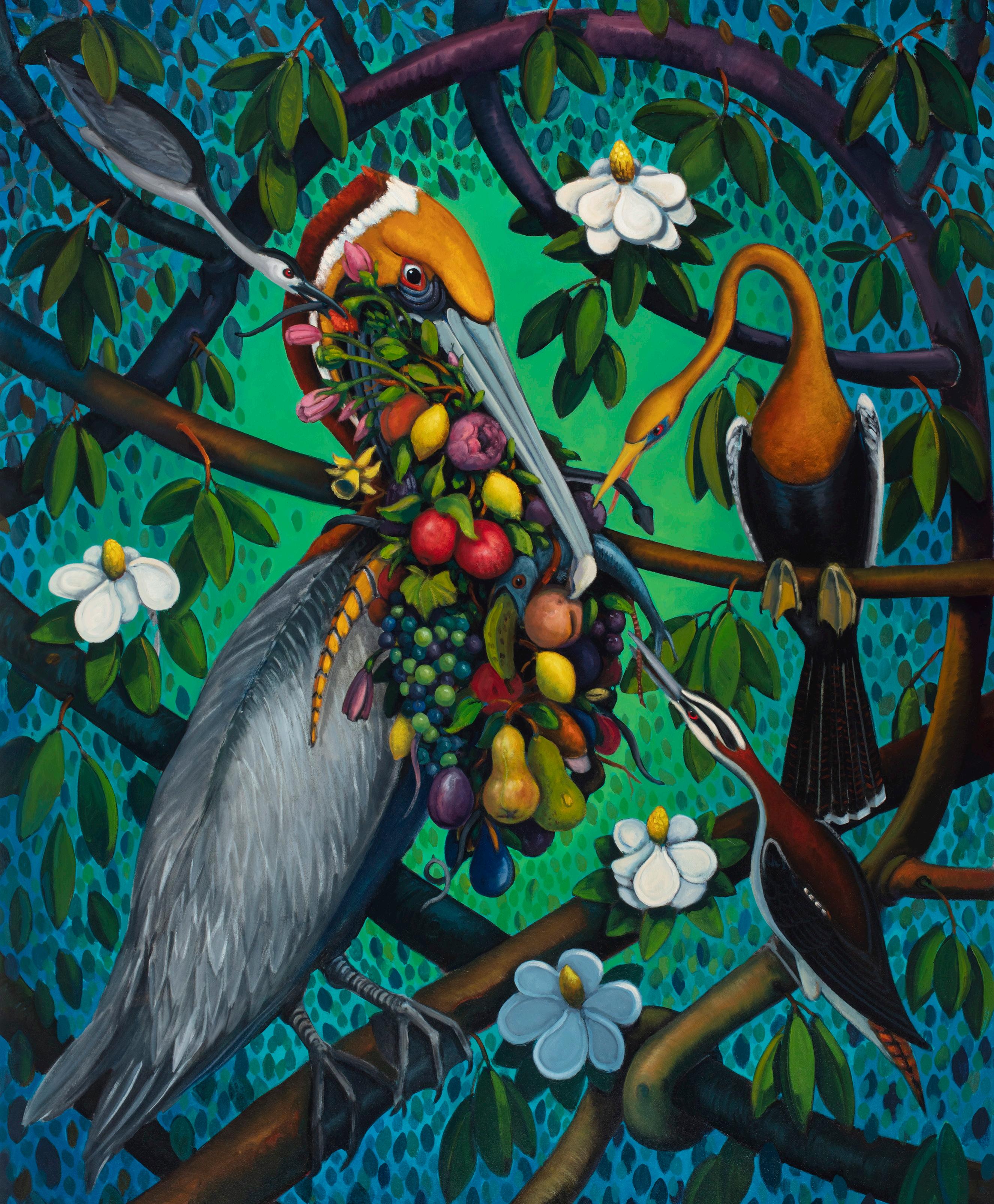 Passionate about conservation, Smith depicts the beauty of the natural world on his canvas. His current oeuvre was inspired by an image of fire ants during Hurricane Katrina. Smith was taken by the beauty and simplicity of these small creatures weaving a living raft, their bodies entwined in a delicate dance. The ants below rise to breathe and those above descend, a ceaseless rhythm of unity afloat on the water’s embrace. In that way, his entangled birds, flora, and fauna represent the struggle of survival, the challenges