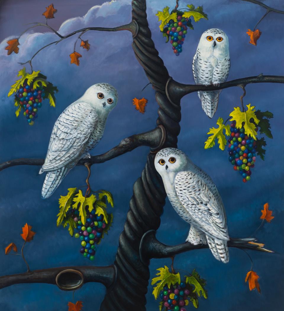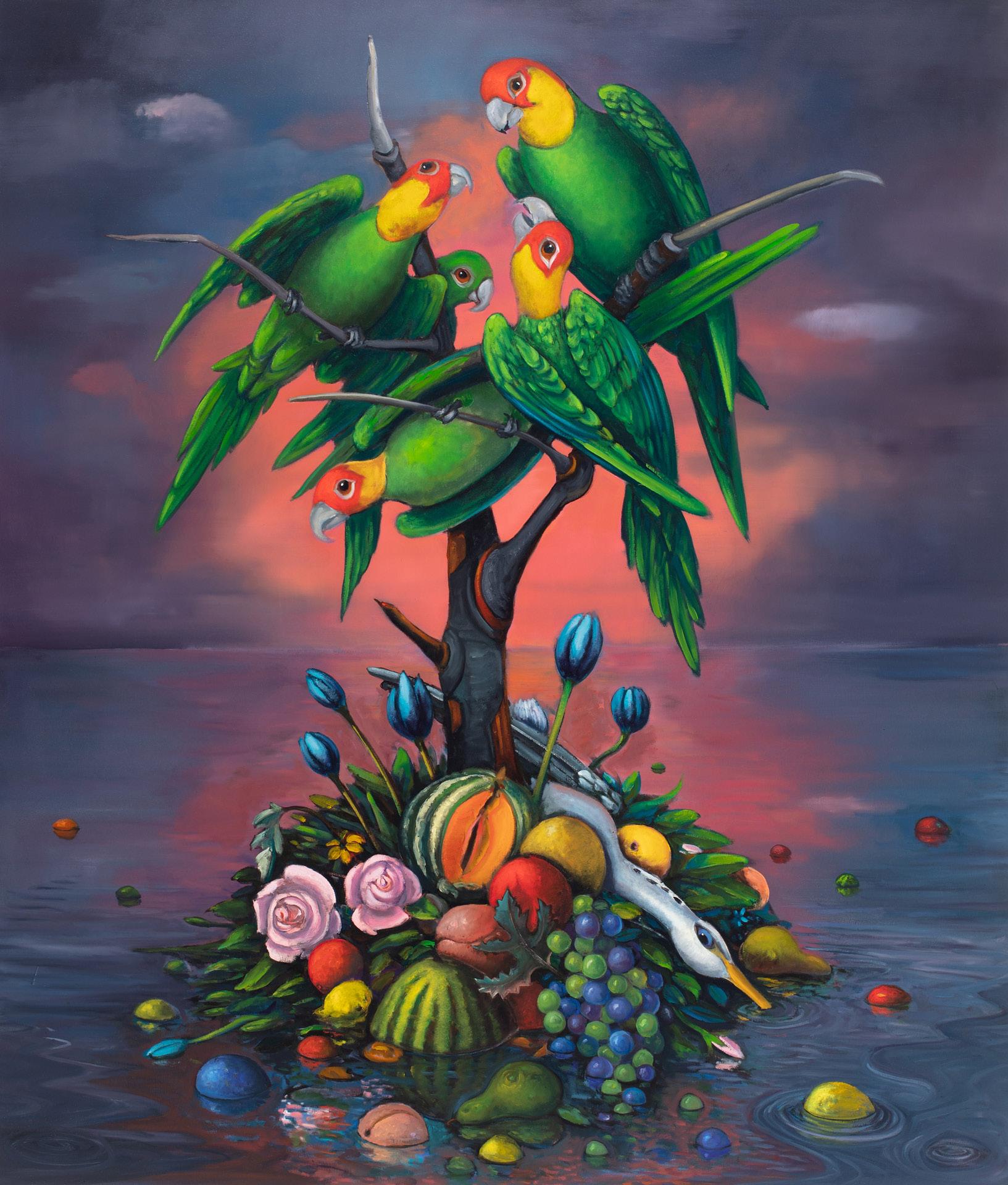 Smith’s paintings often depict entangled birds in vivid, chaotic compositions that reflect both the beauty and fragility of nature.