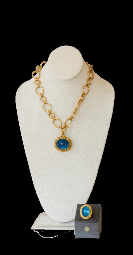 Matching necklace and ring featuring a polished oval gemstone in a golden beaded setting. Items sold separately. Corrinn Fisher Interiors, (985) 888-1229