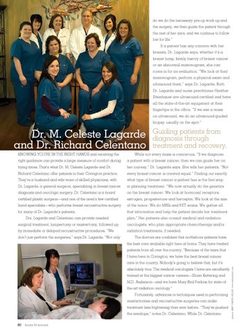 The doctors are confident that northshore patients have the best care available right here at home. They have treated patients from all over the country. “Because of the team that I have here in Covington, we have the best breast cancer absolutely true. The medical oncologists I have are excellently trained at the biggest cancer centers—Sloan Kettering and M.D. Anderson—and we have Mary Bird Perkins for state-ofthe-art radiation oncology.” Fortunately, advances in techniques used in performing mastectomies and reconstructive surgeries can make treatment less frightening than ever before. “They’ve pushed the envelope,” notes Dr. Celentano. While Dr. Celentano