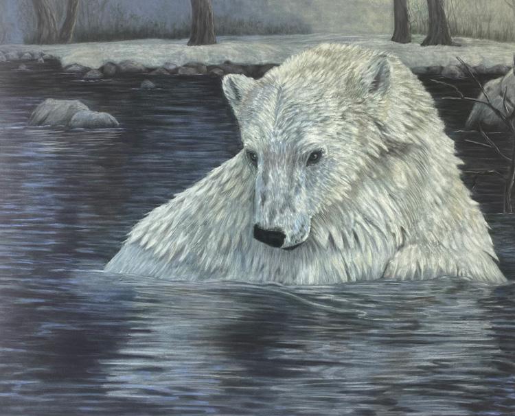 “Polar Bear” was inspired by Rea’s time during her artist residency at the Saskatoon Forestry Farm Park and Zoo. This piece represents the urgency of climate change and the continued need for action. Rea hopes viewers are reminded of our interconnectedness with nature and the importance of preserving animal habitats.