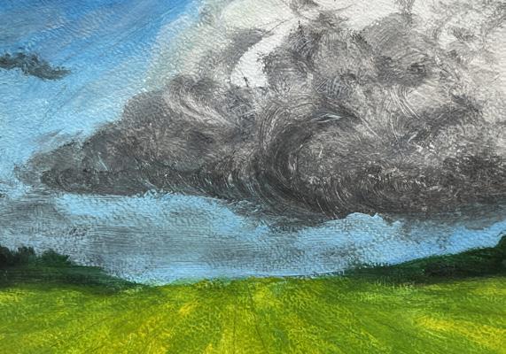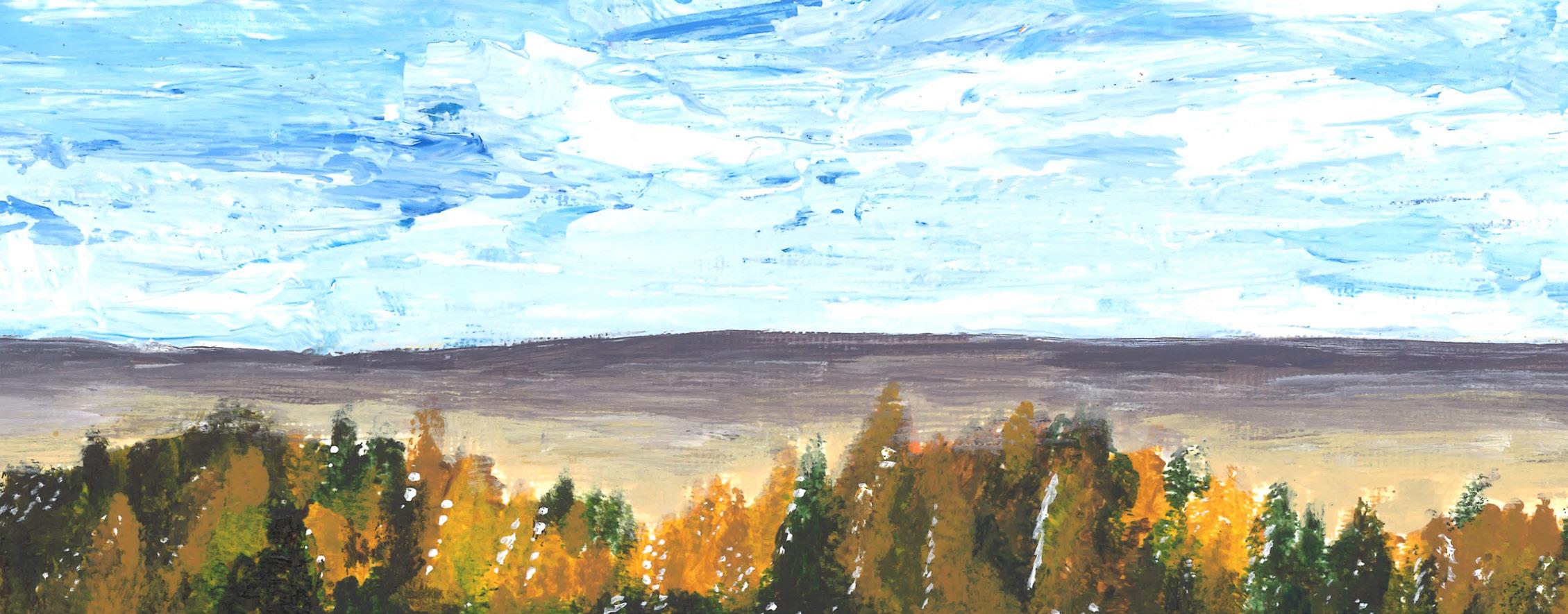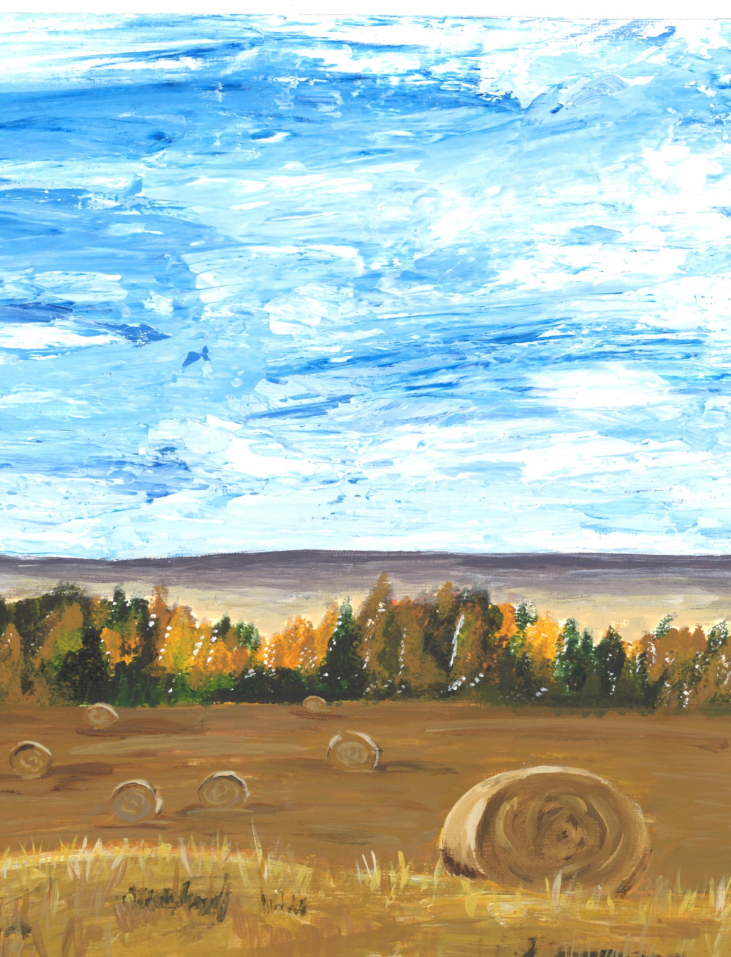 My work necessitates spending a lot of time on Saskatchewan’s roads. Along with ample time for audiobooks and podcasts, a great benefit to travelling across the province is the picturesque view I’m often granted. “Hay Bales” is based on a photo I took on one of my drives. I felt compelled to pull over to capture the wistful clouds, autumnal tree line, and golden hay bales that remind me of my childhood home.