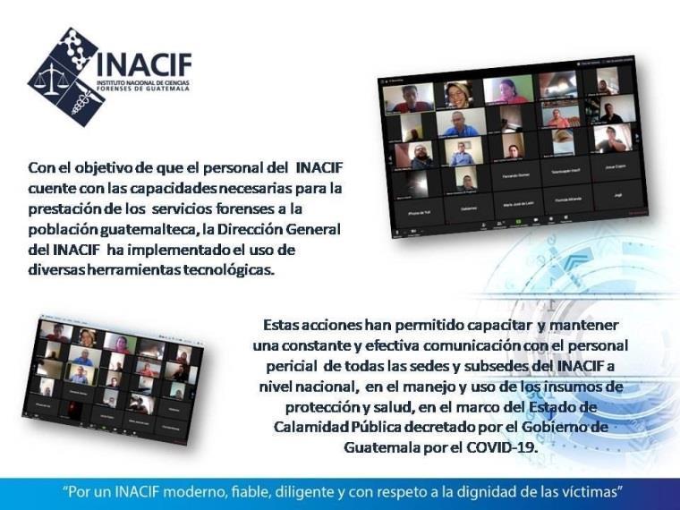 Derivado de los lineamientos gubernamentales establecidos en relación a la Pandemia de COVID-19, la Escuela de Estudios Forenses del INACIF redefinió la planificación de las actividades de capacitación dirigidas al personal de la institución y a personas ajenas a la misma. Con el apoyo de la Unidad Informática se fortaleció la estructura informática para continuar con una metodología de enseñanza virtual. Cabe resaltar, que se continúa en el proceso de fortalecimiento desde la inducción hasta la actualización de conocimientos del personal del INACIF, en las áreas administrativas, técnicas y periciales.