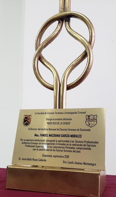 En reconocimiento al compromiso y a la valiosa contribución para el desarrollo mediante el convenio interinstitucional de cooperación académica y científica en ciencias forenses entre el Instituto Nacional de Ciencias Forenses de Guatemala INACIF y las diferentes Universidades de Educación Superior de Guatemala, la facultad de Ciencias orenses e Investigación Criminal de la Universidad de Occidente otorgó al Director General del INACI la distinción Nudo Rizo de la Ciencia como un reconocimiento al compromiso y a la valiosa contribución para el desarrollo de las ciencias forenses. Este reconocimiento fue el primero que entrega la Universidad bajo esta naturaleza, en agradecimiento por el aporte al desarrollo de la ciencia en el pa s.