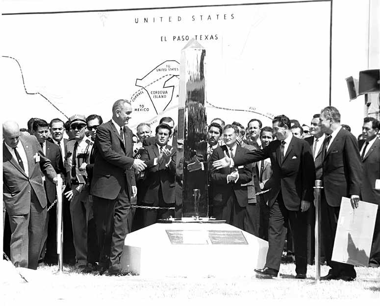 En los terrenos de Bowie High School el 25 de septiembre de 1964, los presidentes Adolfo López Mateos y Lyndon Johnson se dan la mano para conmemorar la firma del Tratado de El Chamizal (cortesía National Park Service).