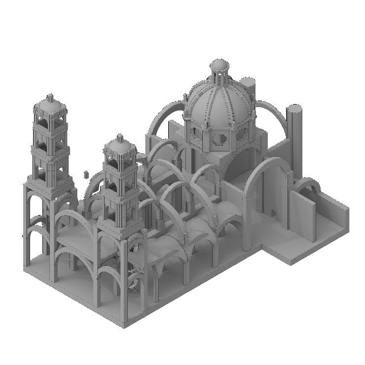Respecto del sistema estructural, este consiste en una armazón de arcos de medio punto que es un sistema desarrollado también en la antigua Roma y que durante casi 2 mil años fue la gran so lución. Los arcos forman tanto el soporte de las bóvedas y de la cúpula como también ayudan a darle fortaleza a los muros. En los cubos de las torres tenemos una superposición de arcos ciegos que ayudan a soportar el gran peso que ronda las 1,500 toneladas. A su vez las propias torres forman un enhuacalado de arcos. Es un arco por cada costado y se visibilizan por el interior del espacio. Las bóvedas son de cañón corrido con lunetos, para la apertura de las ventanas, se construyeron de la misma mampostería que los mu ros. Están estructuradas con arcos llamados torales que son los que van perpendicula res al eje longitu dinal. A su vez los arcos forme ros, paralelos al eje longitudinal, sostienen el peso de la bóveda y lo descargan en sus pilares. La nave lateral que es 6 metros más baja que la nave cen tral, actúa como un refuerzo de esta nave y sus arcos que son peraltados des cargan de manera vertical, sin gran des esfuerzos la terales, hacia la cimentación.