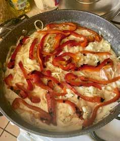 ca de sal; cuando este transparente agrega la harina. Mezcla y vacía una taza de leche moviendo hasta que espese, agrega el espagueti y sazona con sal y nuez moscada. Agrega el resto de la leche, el queso en cubitos y los camarones. Revuelve. Pasados 5 minutos espolvorea perejil picado y está listo para servir.