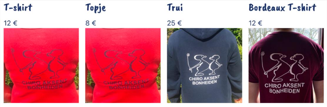 De trui, T-shirt en het topje kan je bestellen via de website. Als we de betaling goed ontvangen hebben zal er een pakketje klaarliggen op het einde van de volgendeChiro-zondag.Pasjelieverhetuniformalvorensjebesteltofkoopjehet liever tochnietonline,dankanjenaiedereChiro-zondagiemandvandeleiding aanspreken.