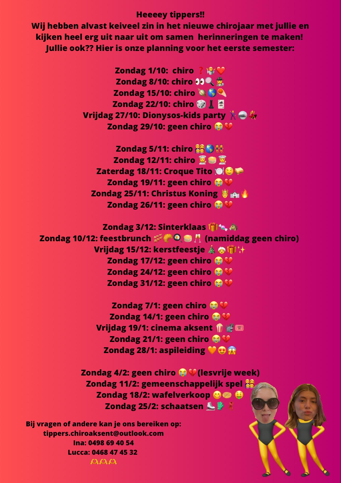 De rol van groepsleiding communicatie wordt overgenomen door Lyse en Ina. Zijn er vragen of opmerkingen,dankunnenjulliesteedsbijonsterecht! Wij staan elke zondag aan de poort als aanspreekpunt, je kan ons ook bereiken via de hoofdmail, c i k e t@ho l.co ofonsbellenofeen sms’je sturen, Lyse: 0468 28 66 62 & Ina: 0498 69 40 54. De mailtjes die jullie ontvangen met informatie of overbelangrijkstechiro-evenementenen-activiteiten krijgenjullievanons.