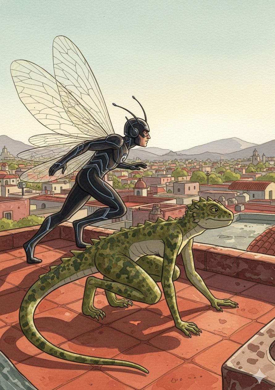 Mosquiman y Gabiguana pelearon juntos. Él desde el aire, ella desde las sombras. Él esquivando con re ejos sobrehumanos, ella resistiendo ataques de ácido con su piel escamosa. Eran opuestos… pero perfectos.