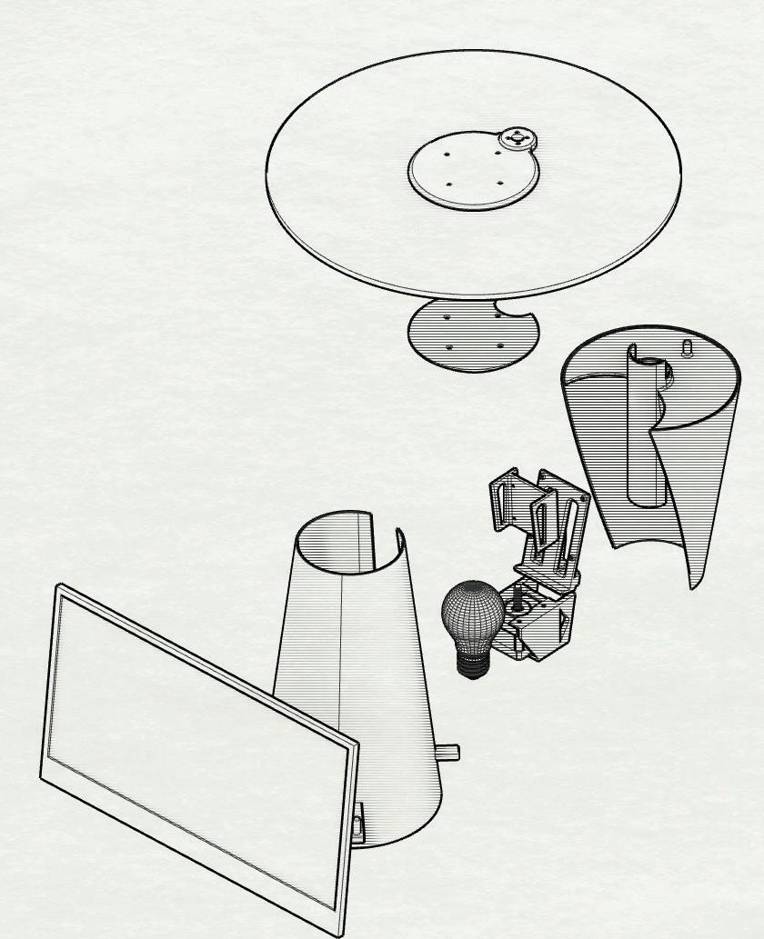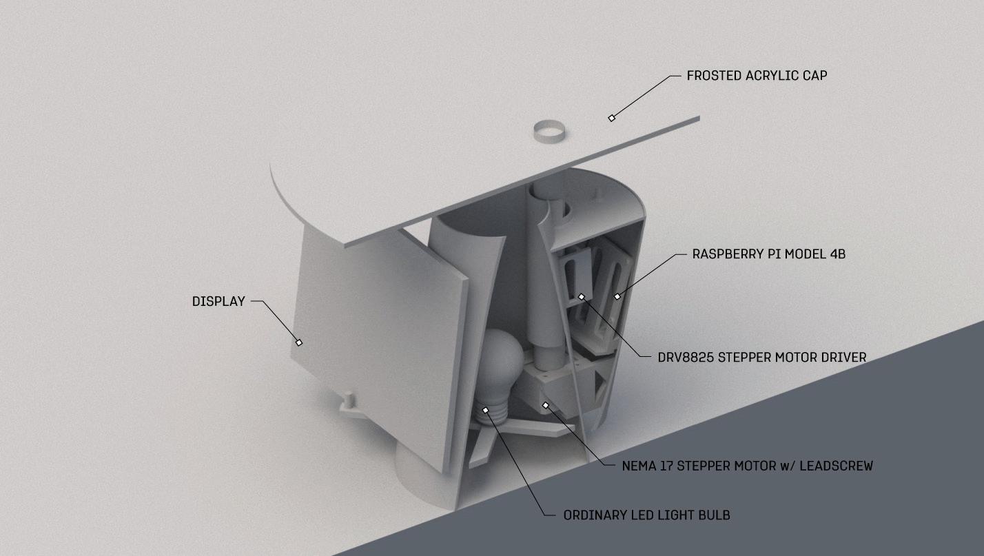The challenge with this experiment was to create a furniture piece capable of altering human behavior and routine. As such I designed a lamp that automatically lowers a frosted glass cap, slowly reducing the light emitted from the bulb to a given space. The 3D-printed enclosure was designed to receive a Raspberry Pi and stepper motor. The Raspberry Pi is the electronic brain of the lamp, sending puzzles or facts to the display. Every time the user tried to reset the lamp, they would first have to interact with the display, either solving the puzzle or learning something new. This may be inconvenient at first, but because humans are skilled at adapting, the act of learning will soon be linked with the act of turning on a light, a crucial resource in modern life.