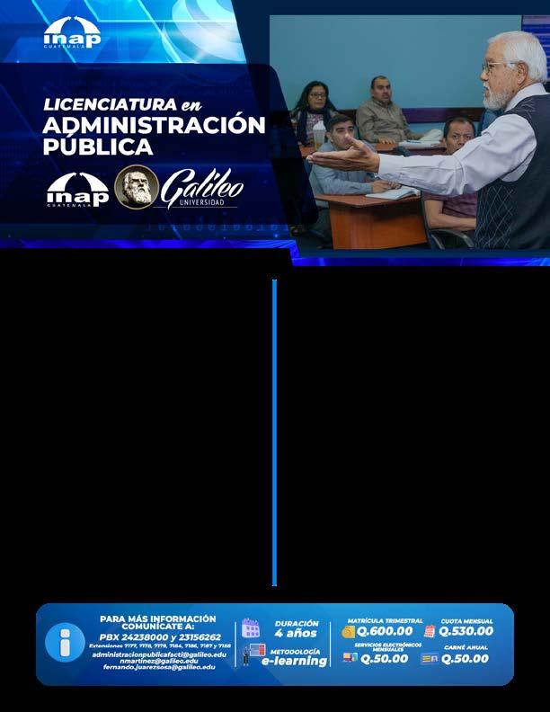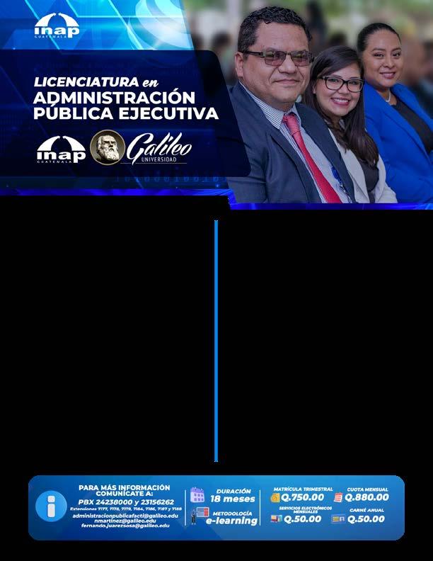 La Licenciatura en administración pública ejecutiva, es un programa desarrollado en conjunto por la Universidad Galileo y el Instituto Nacional de Administracion Pública -INAPdirigida a servidores públicos que cuentan con conocimiento y experiencia laboral en la gestión pública y que además tienen estudios de licenciatura avanzados, ofreciéndoles la posibilidad de obtener el grado académico de licenciatura en 18 meses de estudio.