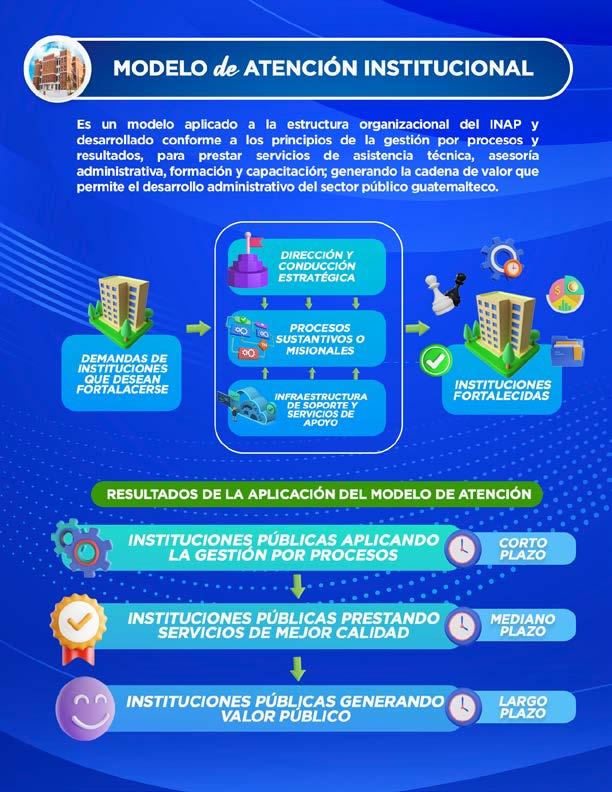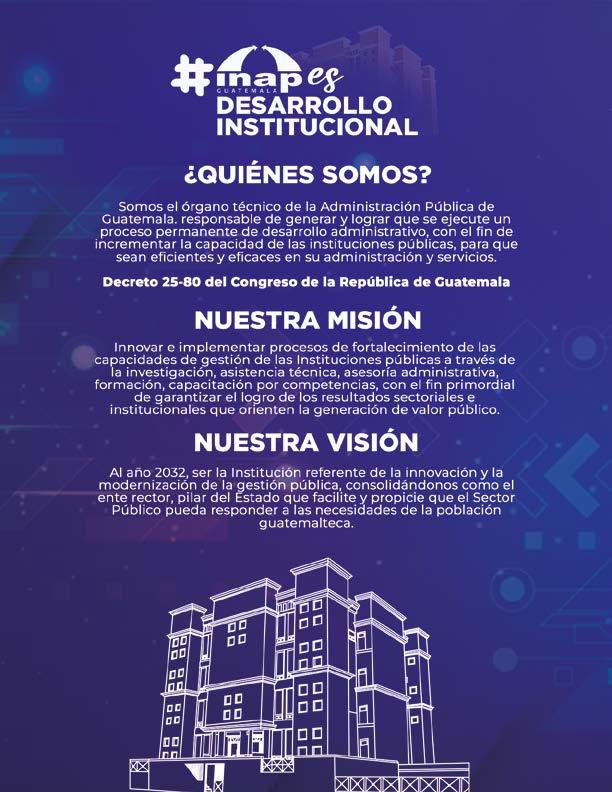 El INAP contribuirá al fortalecimiento de la gestión de las entidades públicas a través de la formación gerencial con orientación estratégica, de servidores y funcionarios públicos, a través de la participación en programas de estudios de postgrado de maestría y doctorado, incrementando la capacidad, eficacia y eficiencia del sector público, desarrollando la capacidad de orientar y dirigir estratégicamente a las instituciones generando valor público, contribuyendo a la reforma del Estado, la transformación y modernización de la Administración Pública guatemalteca.