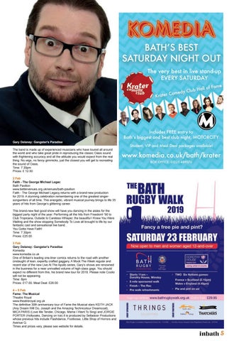 2 Feb Faith - The George Michael Legac Bath Pavilion www.bettervenues.org.uk/venues/bath-pavilion Faith - The George Michael Legacy returns with a brand-new production for 2019. A stunning celebration remembering one of the greatest singersongwriters of all time. This energetic, vibrant musical journey brings to life 35 years of hits from George’s glittering career. This brand-new feel good show will have you dancing in the aisles for the biggest party night of the year. Performing all the hits from Freedom! ‘90 to Club Tropicana, Outside to Careless Whisper, the beautiful I Knew You Were Waiting and the show stopping Somebody To Love all brought to life by our fantastic cast and sensational live band. You Gotta Have Faith! Time: 7.30pm Prices: £25.00 3 Feb Gary Delaney: Gangster's Paradise Komedia www.komedia.co.uk One of Britain’s leading one-liner comics returns to the road with another onslaught of lean, expertly crafted gaggery. A Mock The Week regular and recent star of the new Live At The Apollo series, Gary’s shows are renowned in the business for a near unrivalled volume of high-class gags. You should expect no different from this, his brand new tour for 2018. Please note Coolio will not be appearing. Time: 8pm Prices: £17.00, Meal Deal: £28.00 4 – 9 Feb Fame: The Musical Theatre Royal www.theatreroyal.org.uk The definitive 30th anniversary tour of Fame the Musical stars KEITH JACK (Any Dream Will Do, Joseph and the Amazing Technicolour Dreamcoat), MICA PARIS (Love Me Tender, Chicago, Mama I Want To Sing) and JORGIE PORTER (Hollyoaks, Dancing on Ice).It is produced by Selladoor Productions whose previous hits include Flashdance, Footloose, Little Shop of Horrors and Avenue Q. Times and prices vary, please see website for details.