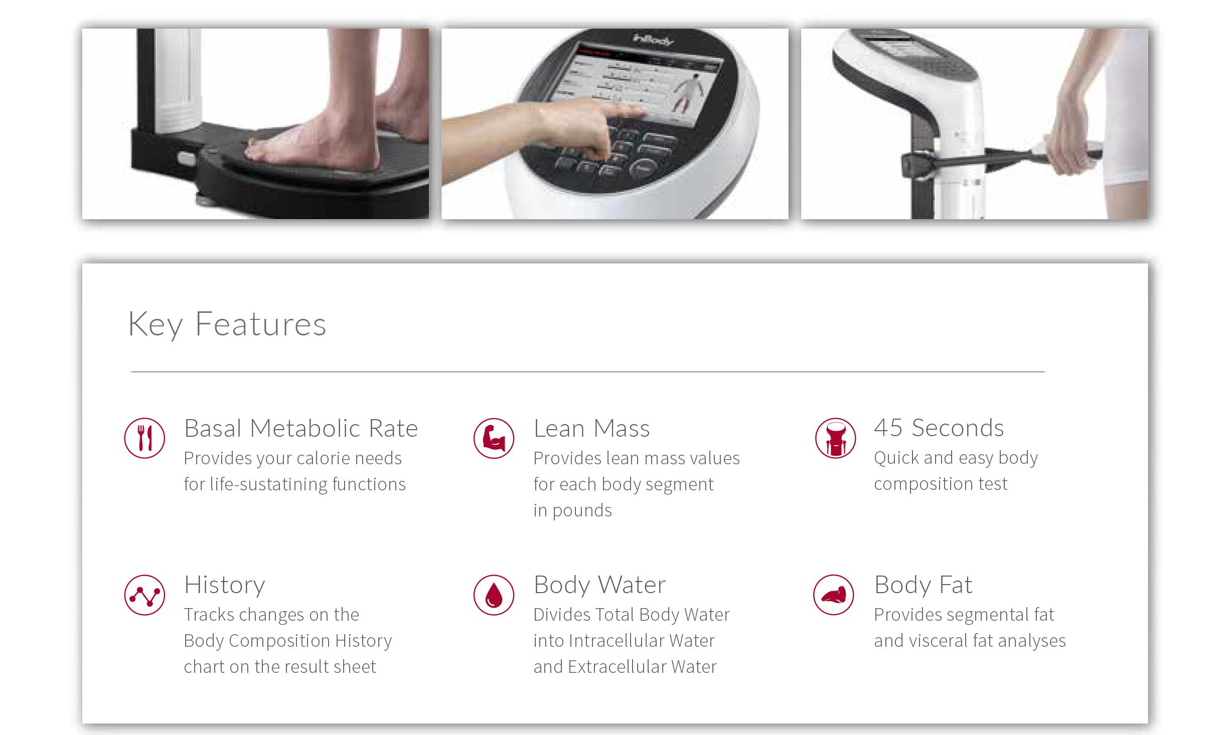 The InBody 270 goes beyond weight and measures how much lean mass you have in each body segment as well as your Percent Body Fat. With these values, you can accurately and precisely monitor how your body is adjusting to dietary changes, fitness routines, and lifestyle modifications.