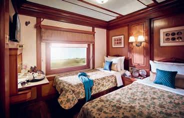 De trein bestaat uit minimaal 13 rijtuigen en biedt plaats aan maximaal 60 passagiers. U overnacht in een gezellig, met fraai houtwerk en warme kleuren gedecoreerd compartiment (10 m2) voorzien van 2 losse bedden of een tweepersoonsbed. Verder beschikt uw compartiment over een zitje met stoelen en tafel, minibar, kledingkast en een privébadkamer met wastafel, douche en toilet. In ieder slaaprijtuig bevinden zich 3 slaapcompartimenten en een compartiment voor uw steward. Uw steward zorgt er 24/7 voor dat het u aan niets ontbreekt tijdens de reis.