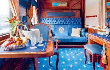 met tafels en comfortabele stoelen, waar spellen en boeken beschikbaar zijn. Uniek is het wellness- en fitnessrijtuig. Hier kunt u zich laten verwennen met een Ayurveda-massage of een schoonheidsbehandeling. Er is zelfs een stoombad. De fitnessruimte is voorzien van een loopband, fiets en gewichten. Voor medische zorg reist een arts mee.