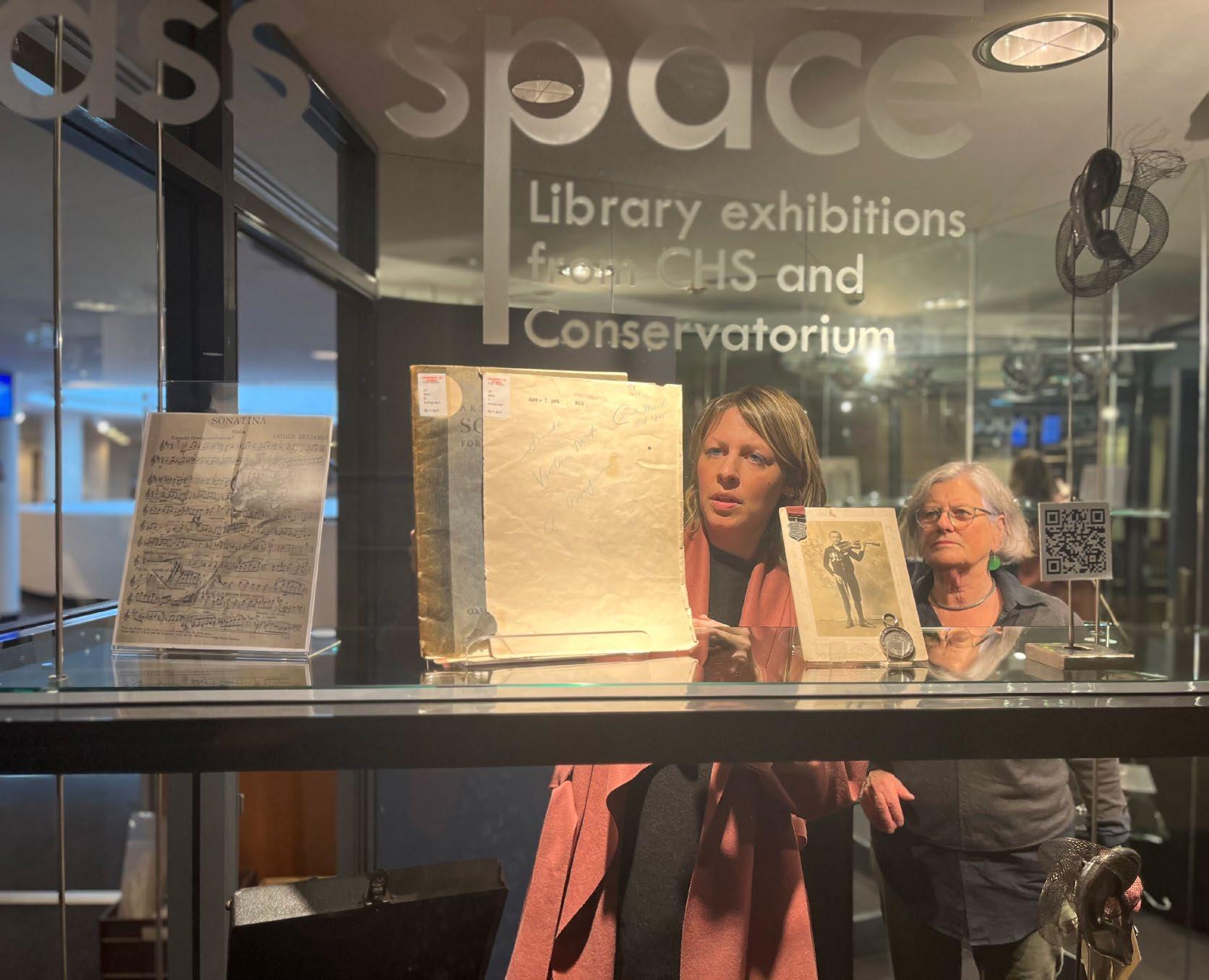 Mark McKay (right), RA&HS Head of Strategy, and Erin Reardon, RA&HS Museum and Archives Coordinator, with items from the RA&HS Beatles Collection.