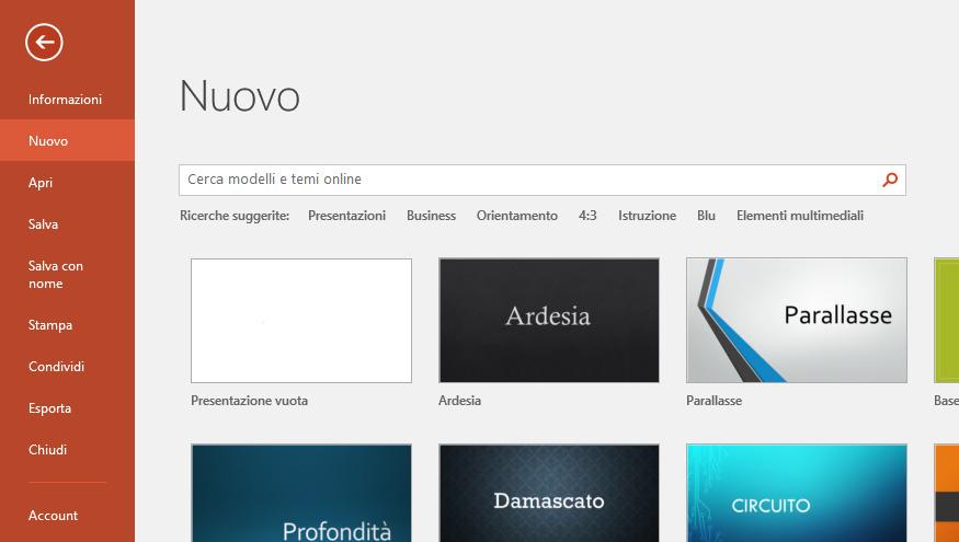 Iniziare con una presentazione vuota per mettersi subito al lavoro. Oppure, per risparmiare tempo, selezionare e quindi personalizzare un modello che soddisfa le proprie esigenze. Fare clic su File > Nuovo e quindi selezionare o cercare il modello desiderato.