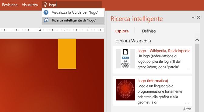 Con Ricerca intelligente PowerPoint cerca informazioni pertinenti su Internet per definire parole, frasi e concetti. I risultati della ricerca visualizzati nel riquadro attività possono fornire contesto utile per le idee condivise nella presentazione.